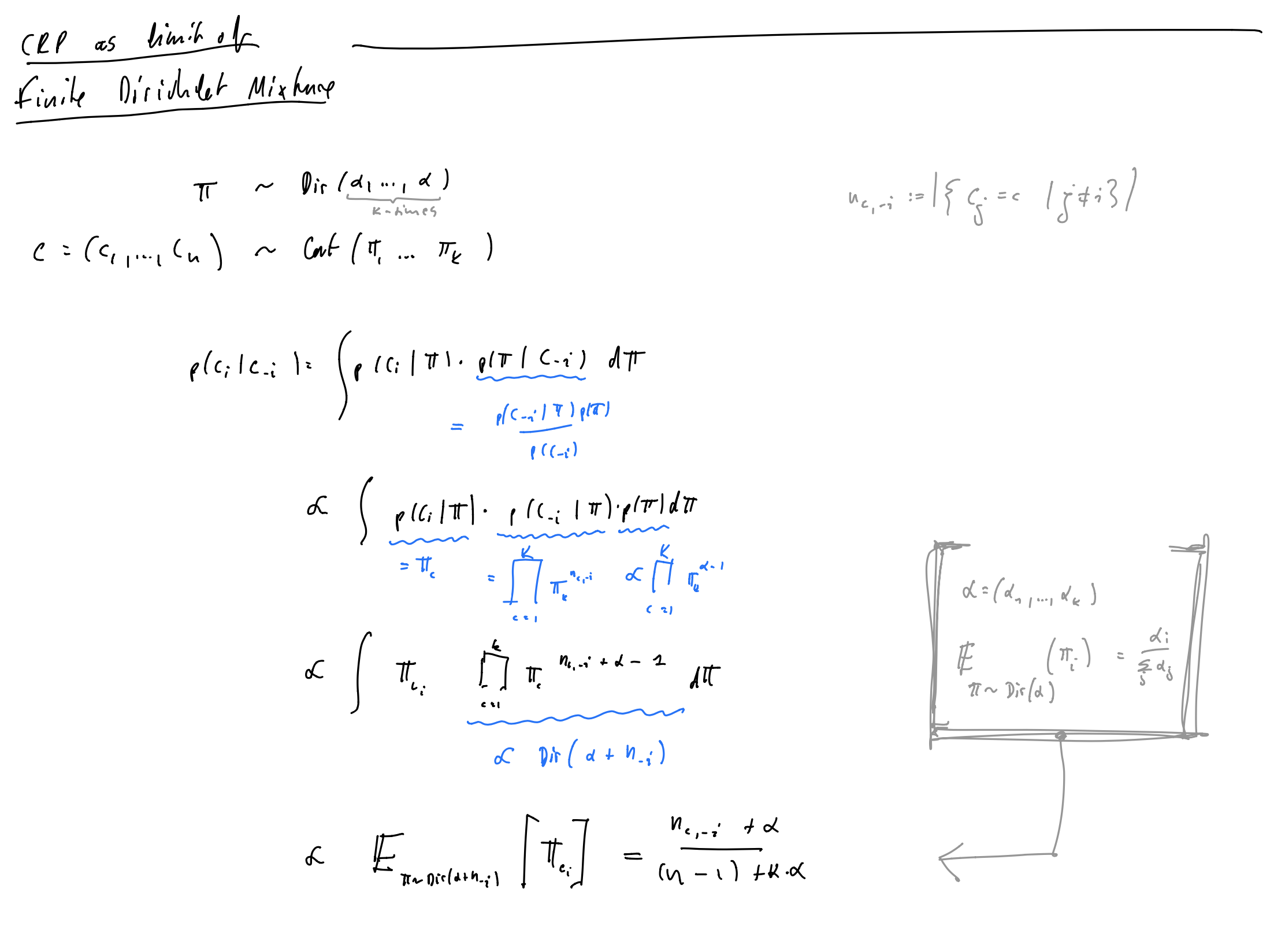 \[\tag{DIR} \begin{eqnarray*} p(c_{t} = i \mid c_1,\ldots,c_{t-1}; \alpha, k) = ... = \frac{\tfrac{\alpha}{k} + n_{i,t-1}}{\alpha + t - 1}, \end{eqnarray*}\]where $n_{i,t}$ denotes the size of cluster $i$ at time $t$, that is \(n_{i,t} = \vert\{ c_s : c_s = i, s\leq t \}\vert\).